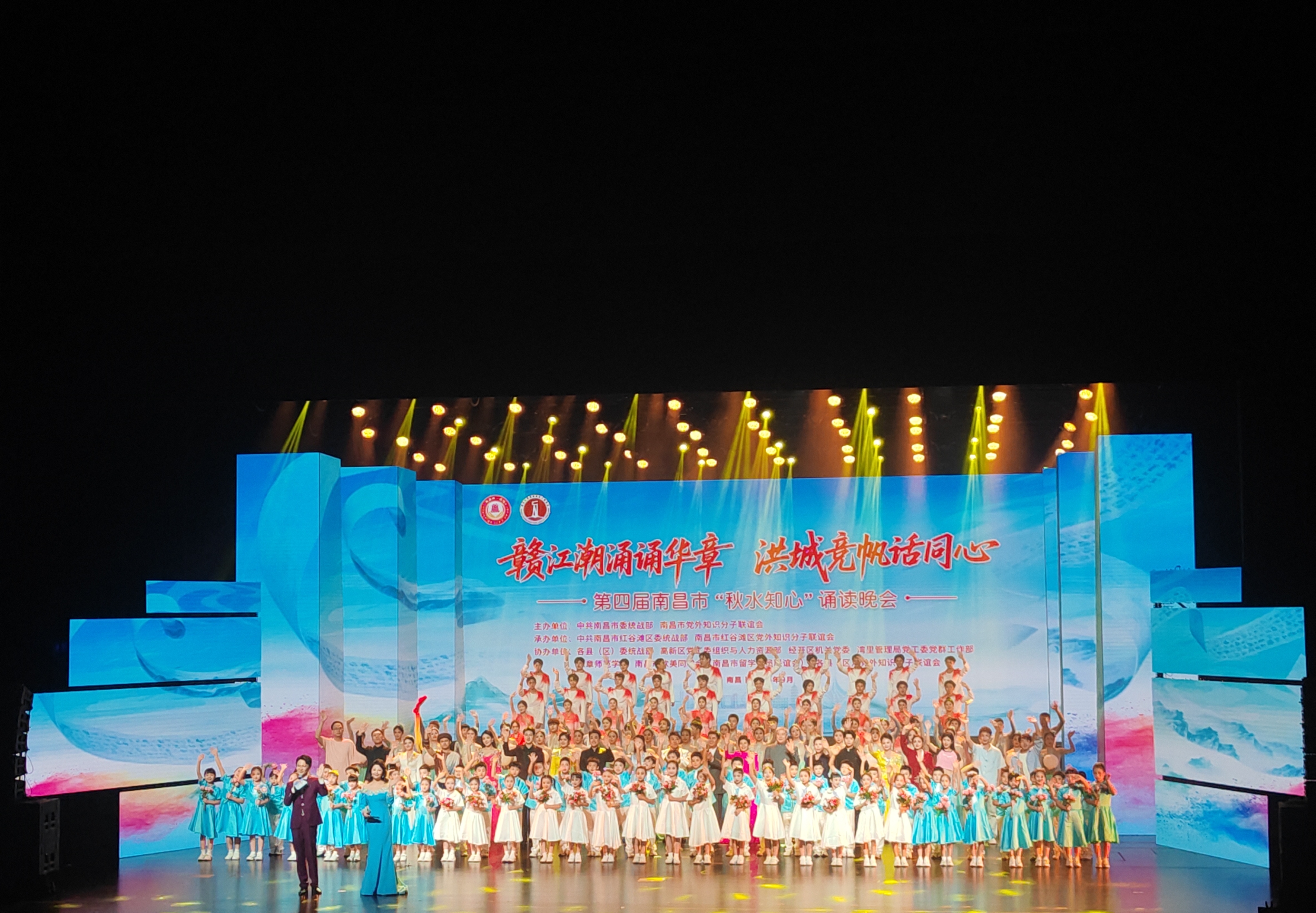 此次诵读晚会由市委统战部、市知联会主办,红谷滩区委统战部、区知联会承办,以“赣江潮涌诵华章,洪城竞帆话同心”为主题,既是对红色基因的深情传承,更是对新时代统战使命的生动诠释。晚会以经典诵读作品为主,将“歌、舞、诵、演”与“声、光、电”相结合,由序篇、第一章、第二章、第三章、尾声五个部分组成。其中,序篇主题为“秋水知心共长天”,展现南昌深厚的历史文化底蕴和新时代南昌的蓬勃发展变化;第一章主题为“烽火忆峥嵘”,弘扬伟大抗战精神;第二章主题为“山河映丹心”,表达浓浓家国情怀;第三章主题为“盛世颂华章”,热情讴歌国庆主题与时代成就;尾声主题为“同心共筑中国梦”,颂扬统一战线“大团结、大联合”的盛世繁华,并以合唱《灯火里的中国》作为全场高潮与结束。